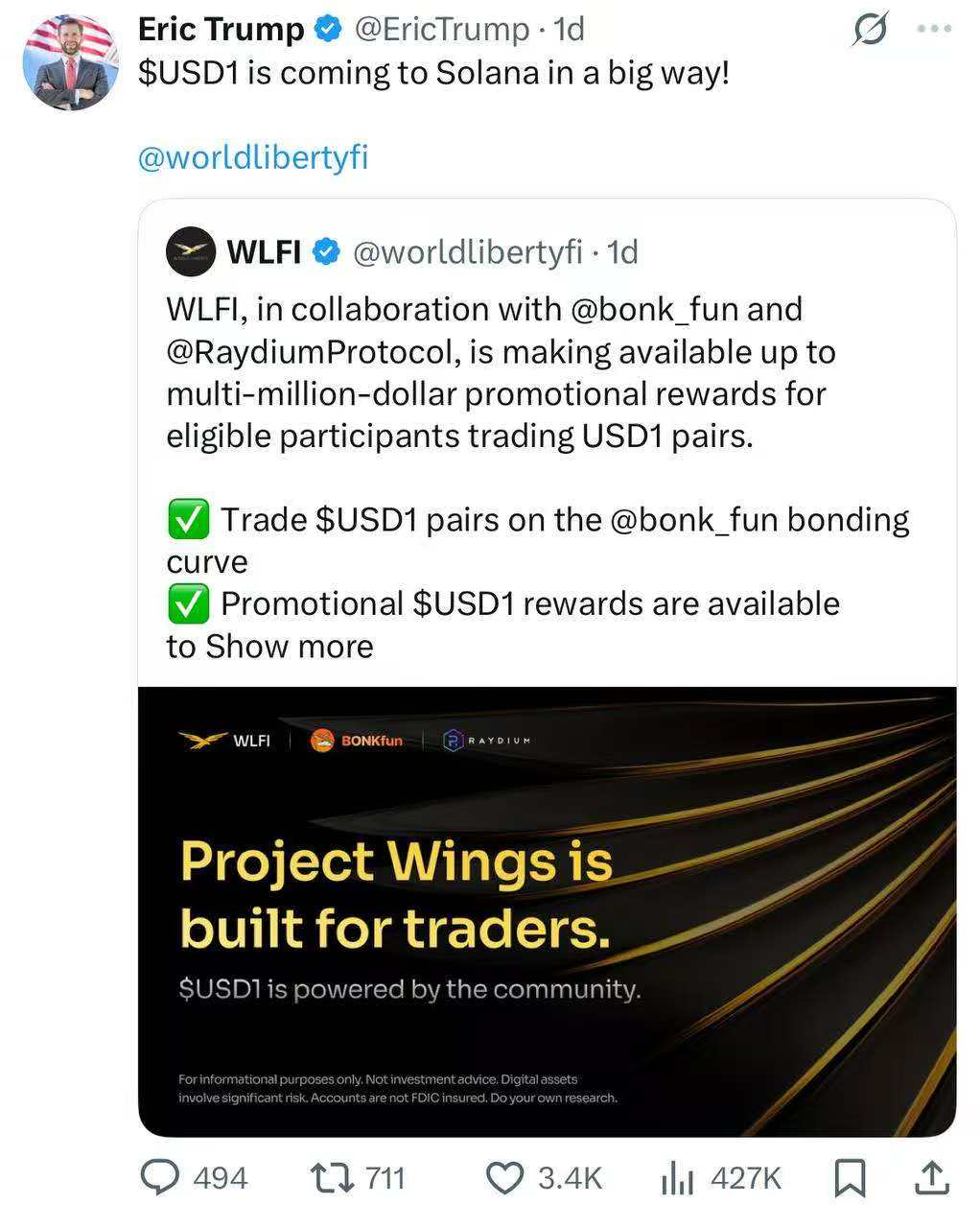特朗普与 BONK 合作,进军 Solana美国总统唐纳德·特朗普的儿子埃里克·特朗普(Eric Trump)宣布,World Liberty Financial($WLFI)将与 BONK (@bonk_inu) , BONK.fun 和 Raydium合作,携带 $USD1 登陆 Solana。图片分享