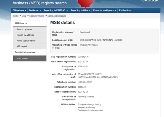 为了向客户提供更多优质的金融服务和交易体验,经过加拿大金融交易和报告分析中心(FINTRAC)的严格规范的审核,WEEX INTERNATIONAL EXCHANGE LTD在 2021年12月24日注册货币服务业务(Money Services Business,MSB)牌照,现已获得批准,营运牌照的有效期限为2024年12月31日。