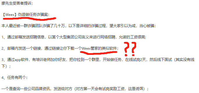 据了解,这类骗局常以“投资返利”“网赚刷单”为诱饵,通过QQ群、微信群、陌生好友等途径发送下载链接或二维码,诱导用户安装假冒的“Weex app软件”“Weex证券”等APP。初期会返还小额资金以获取信任,随后要求受害者充值更大金额,并在提现时以“账户异常”“操作错误”为由拒绝提现,甚至设置额外费用、保证金,最终导致资金无法追回。这就属实很躺枪了,一个叫WEEX的兼职任务平台,把全球领先的Web3加密资产平台给碰瓷了。